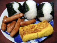 おにぎり、ソーセージ、卵焼きと