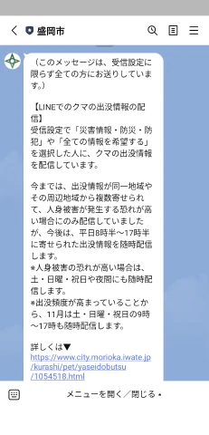 わたしは盛岡の出身なんですが、盛岡市からクマ情報を配信してくれるというラインが…