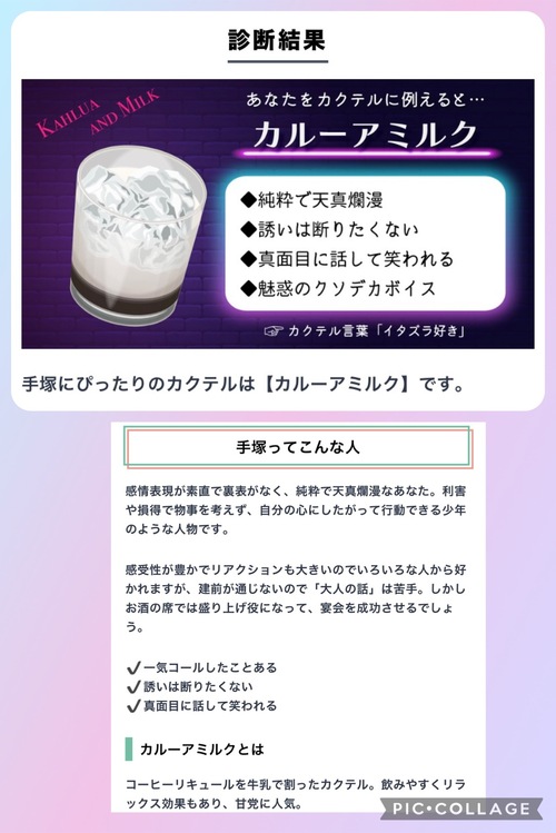 こんにちは(*^^*)いつもたくさんお誘いありがとうございます(*^^*)今日も先程までリピさんも、お誘いありがとうございました(*^^*)リピーターさんと、新規さんから、おもしろいとほめてもらえた診断テスト今回は、手塚をお酒に例えるとです(*^^*)手塚 お酒弱いです(*^^*)(笑)カルーアミルクは甘いので飲めます(*^^*)コーヒー牛乳みたいで美味しい何年も飲んでません^-^夜出歩かないし、夜飲むと筋トレの効果なくなりそうなので(笑)なんか、今日のお昼あたりから女の子近々来そうな気がしてます(汗)まだ何日かは大丈夫そうですけど…日曜日まで持つかなぁ(*^^*)(笑)土曜日の夜からラストはリピさんから予約入ってるので、みなさん色々都合あるとは思いますが、早めに呼んでもらわないと、来週だとしばらく会えなくなっちゃうかもです(>_<)お盆は出勤したいから、今は無理できないんですよ^-^いつでも出勤できるわけではないから、タイミング大事ですよね(*^^*)蒸し暑いので、体調気をつけてね(*^^*)手塚