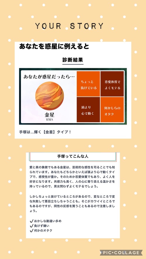こんばんは(*^^*)いつもたくさんお誘いありがとうございます(*^^*)手塚さんの診断テストおもしろいと何人かのリピさん・新規さんからほめてもらえたので、今は時間あるから載せますね(*^^*)時間ないと載せれないので(笑)当たってますね(*^^*)手塚