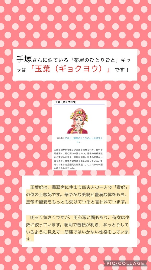 こんばんは(*^^*)大好きな薬屋のひとりごとのキャラ診断をしてみたら、玉葉妃に(*^^*)おっとりとか、いつもにこにこしてて、明るいとか、好奇心旺盛だねとか、ゆるふわとは、まわりから言われますが、聡明かどうかは(涙)(笑)したたかって言われてますね(笑)確かに、慎重だったり、警戒心強かったり、用心深い面も実はあります(>_<)過去の経験から学んだんですよ(笑)猫猫にはならなかったけど(*^^*)玉葉妃も大好きだから光栄ですこのアニメ好きすぎてハマりました(*^^*)猫猫は口は悪いしツンデレだけど、本当は優しくていい子(*^^*)うちの娘みたい(笑)映画化とかしてくれないかなぁアニメでね(*^^*)日記見てくれてありがとうございます(*^^*)いいねも感謝しますまた夜寝る前に日記更新しますね(*^^*)手塚