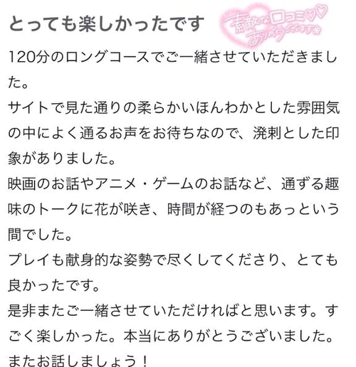 お誘いありがとうございます❣️ 最初から穏やかに接してくださり、安心して過ごすことができました😌居心地が良くて、つい時間を忘れてしまうほどでした🤭お話も自然と弾んで、楽しいひとときでした✨️優しい雰囲気で心がとても和みました🙆♀️💓また遊びに来てくださいね💕︎