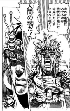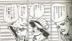 そのまま追い詰められるが、ジャイロはもう1つの鉄球で岩を砕き、飛び散った破片で反撃し、そのまま2人で逃走する