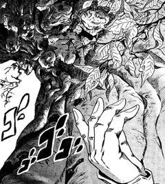 シュガー・マウンテンは大木に落ちたものに対して、落ちたものと高価なもの、どちらが落としたものかを聞き、正直に答えると双方を与えてくれる存在だが、その高価なものを使い切らないと体に大木が生えて体が固まってしまうというスタンド能力を持つスタンド、シュガーマウンテンの泉↓