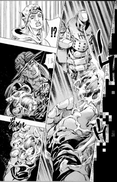 サンドマンの攻撃に絶命寸前まで追い込まれるが、ジョニィはジャイロから爪弾の回転の極意を教わり、反撃する