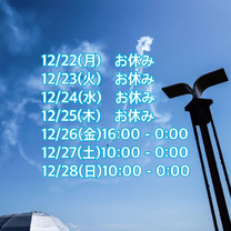 | 12/24(水) | 12/25(木) | 12/26(金) | 12/27(土) | 12/28(日) | 12/29(月) | 12/30(火) |