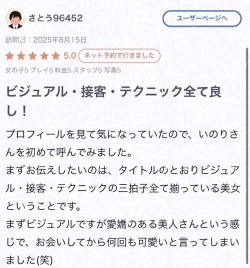 【お礼写メ日記】 10月21日 00:00 @いのり クチコミありがとうお礼書くのだいぶ遅れてごめんね2回遊びに来てくれてるね一回目も二回目も話してるだけでも楽しかったなんか気が合うというか…話しててとても気が楽でしたお風呂で洗い合いもしたね!毎回 時間と共にフィニッシュするように頑張って調整する姿が印象深く 興奮します愛嬌がいいなんて褒め言葉、とても嬉しいですほんとにありがとうオキニトークも今でもしてくれてて嬉しい!☀️たくさん返せるようにがんばりますまた会いたいので、無理のない時に会えるの楽しみにお待ちしてます POST さん あなたのいいねが女の子に伝わります! 0 マイページにログインすると、 記事にいいねをおこなえます!
