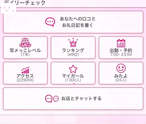 1300 1月21日 20:45 @ソウ こんばんは🫶 マイガール1300人登録 ありがとうございます💓 1500人突破したら何かしたいな🎉⁉️ 口コミも無事60件ありがとうございます💓 本日も🙏あと少し空きあるのでよろしくです🙏 POST さん あなたのいいねが女の子に伝わります! 0 マイページにログインすると、 記事にいいねをおこなえます!
