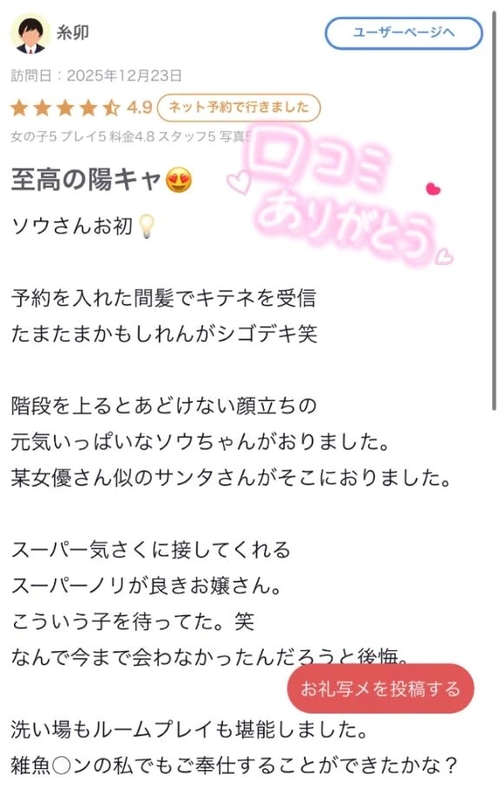 おはそう 1月5日 07:03 @ソウ おはようございます⛄️ 日曜日ありがとうございました︎💕︎︎💕︎ 良い一日で帰ったらぐっすり眠れました😴 オーラスは本日ラストです💓 明日は15時の電車しか取れなかったので💦お昼までがんばります💪よろしくお願いします🙌 POST さん あなたのいいねが女の子に伝わります! 0 マイページにログインすると、 記事にいいねをおこなえます!