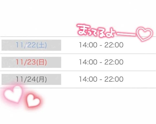 次の出勤です 11月21日 08:48 @みい こんにちは🎀💭 明日から3連休ですね!おやすみのお兄さん方も多いのでは?!23日、24日はP-1でお得に遊べちゃいますよ 次の出勤はこちらです⬇️22日14:00~22:00P-1✨️23日14:00~22:00P-1✨️24日14:00~22:00 3日間とも🈳ありますので事前予約もお待ちしております🙇♀️💖 お兄さん方にお会いできるの楽しみにしてますまたね〜👋みい𓂃🎀𓈒 𓂂𓏸 POST さん あなたのいいねが女の子に伝わります! 0 マイページにログインすると、 記事にいいねをおこなえます!