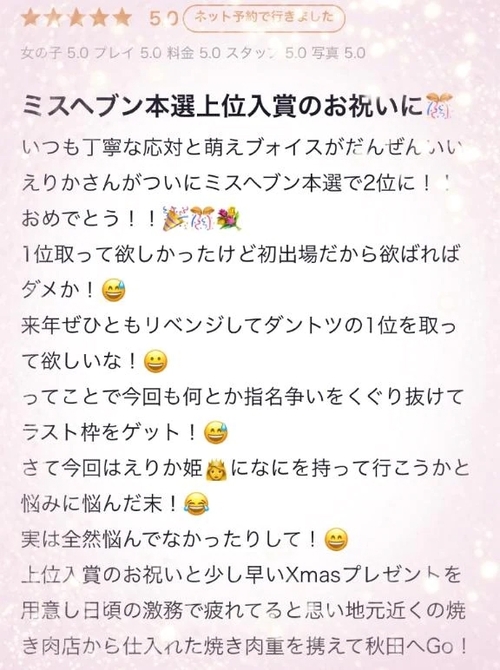 ありがとう.· 2025年12月28日 22:23 @エリカ 年内ラスト出勤❤️退勤しましたっっっ!会いに来てくれたお兄様忙しい中時間を作ってくれてありがとう‼︎🥰また元気に会えたら嬉しいな🫶🏻来年もよろしくお願いします(*´˘`*)エリカ POST さん あなたのいいねが女の子に伝わります! 0 マイページにログインすると、 記事にいいねをおこなえます!