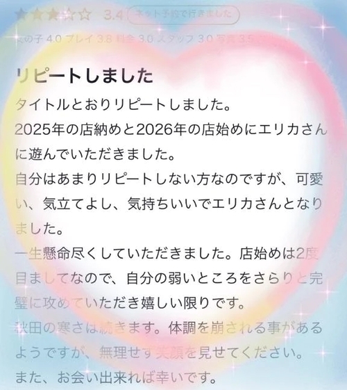 お礼写メ日記💌 1時間前 @エリカ 口コミ投稿ありがとうございます💖先日は、エリカと遊んでくれて本当にありがとうございます!また、お会いするとこができて嬉しかったです楽しんでいただけて良かったです😊また、タイミングが合ったらお店に遊びに来てくださいね♪ありがとうエリカ POST さん あなたのいいねが女の子に伝わります! 0 マイページにログインすると、 記事にいいねをおこなえます!