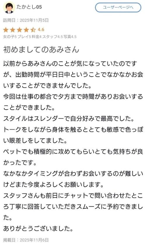 【お礼写メ日記】 11月6日 22:21 @あみ◆8/29入店 遠くから来ていただいてありがとうございました❤️とてもお話しやすく安心してプレイできました🥰攻め方も素敵で楽しい時間を過ごせました😍 POST さん あなたのいいねが女の子に伝わります! 0 マイページにログインすると、 記事にいいねをおこなえます!