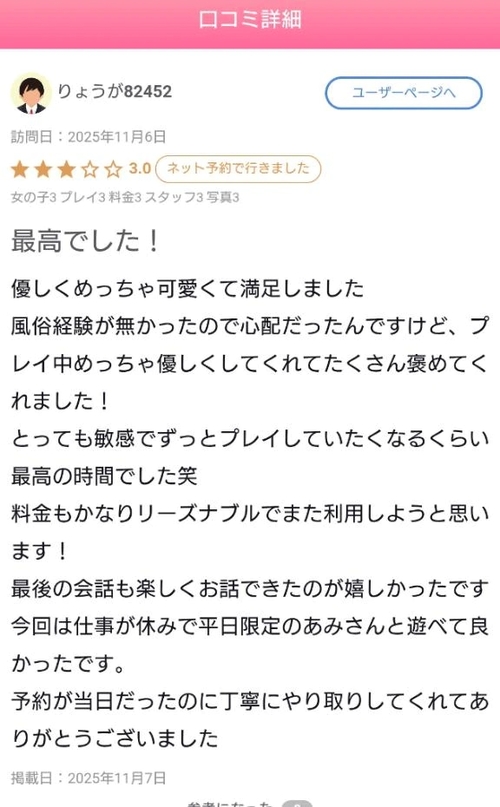 【お礼写メ日記】 2日前 @あみ◆8/29入店 お話しも楽しく素敵な時間を過ごせました🥰確認しながらプレイできて楽しかったです🤭お口に出してもらえたらな〜なん思っていたけど、あみでは力不足で申し訳なかったです🥲また機会があったらチャレンジさせてください🥰 POST さん あなたのいいねが女の子に伝わります! 0 マイページにログインすると、 記事にいいねをおこなえます!