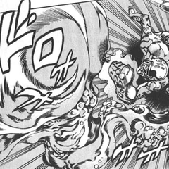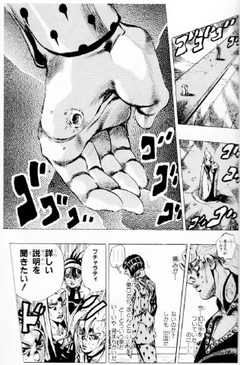 ジョルノはカビの力でバラバラとなったチョコラータに苦戦するが、ミスタの弾丸をゴールドエクスペリエンスで進化させ、チョコラータの脳みそに打ち込み、勝利を収めた