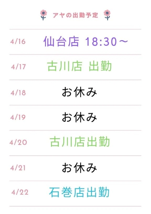次回出勤 4月11日 12:02 @アヤ こんにちは😊✨花見しようかなぁと思っていたら散り始めて来て花より団子になりそうな気がするアヤです🧐皆さんお花見しました🌸??次回出勤が決まりまして…😌🎀13日月曜日になります🥺よろしくお願いします🙇♀️♡ POST さん あなたのいいねが女の子に伝わります! 0 マイページにログインすると、 記事にいいねをおこなえます!