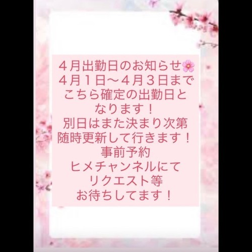 4月の確定出勤日なり🍓 3月31日 10:03 @せりな 4月の確定出勤日だよ‼️ 4月・5月は少し忙しくなってしまい 出勤日に限りが出てくると思われます💦 なのでお時間合うタイミングに ぜひ会いにきてくれたら せりなは嬉しいな🫣🍀 ヒメチャンネルにて リクエスト等もお待ちしてます! ※デートコース(6時間以上)の場合は 事前にヒメチャンネルにて メッセージください😳☺️ お兄さんに会えること せりな楽しみにしてます❤️ POST さん あなたのいいねが女の子に伝わります! 0 マイページにログインすると、 記事にいいねをおこなえます!