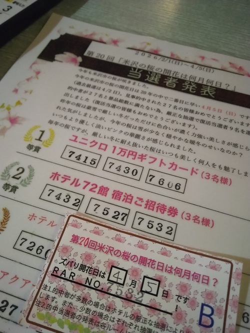 前回の時に書いた、72館の米沢桜開花予想の抽選結果が気になってて、ちょうど、日記で〇ーちゃんに来て欲しいて呼びかけようと思ってたら、まさかの今日会えてびっくり!!!〇ーちゃんに呼ばれる直前まで文章考えてたの(>_<)