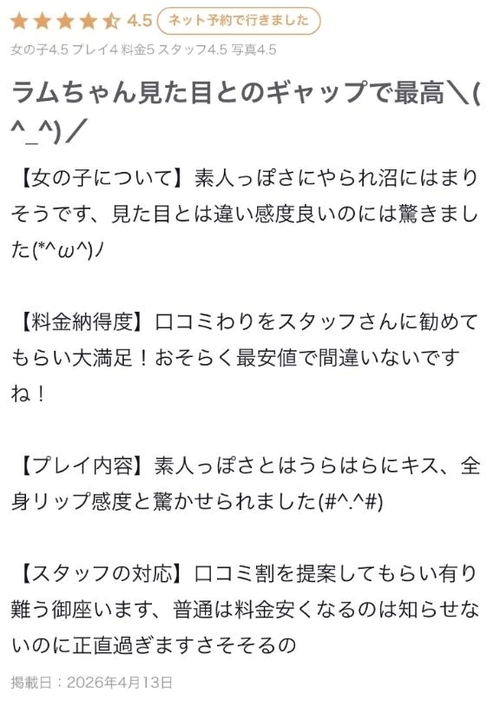 ありがと 4月11日 16:25 @らむ 本日最初のおにーさん✨気さくにお話してくださって楽しかった〜😆スタッフさんのおすすめで気になってくれたみたい!呼んでくれてありがとう❣️普段はキスされるのが好きなんだけど、恥ずかしがり屋さんなのが可愛くって私からキスしちゃった♡♡また呼んでくれるかな?差し入れもありがとうでした😊 POST さん あなたのいいねが女の子に伝わります! 0 マイページにログインすると、 記事にいいねをおこなえます!