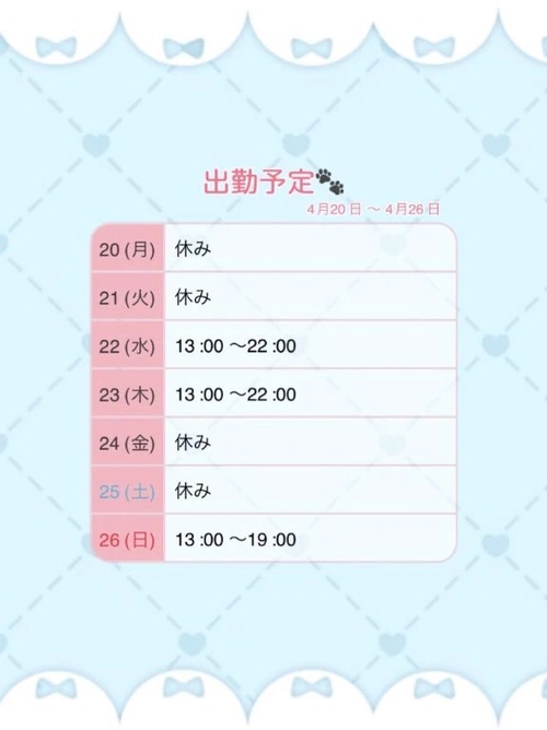 出勤予定 4月17日 20:15 @みお こんばんは🌙みおだよ~՞・֊・՞来週の出勤予定決まりました!!!写真をチェックしてね💕︎ POST さん あなたのいいねが女の子に伝わります! 0 マイページにログインすると、 記事にいいねをおこなえます!