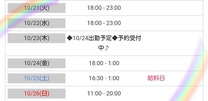 10/21(火) | 10/22(水) | 10/23(木) | 10/24(金) | 10/25(土) | 10/26(日) | 10/27(月) |